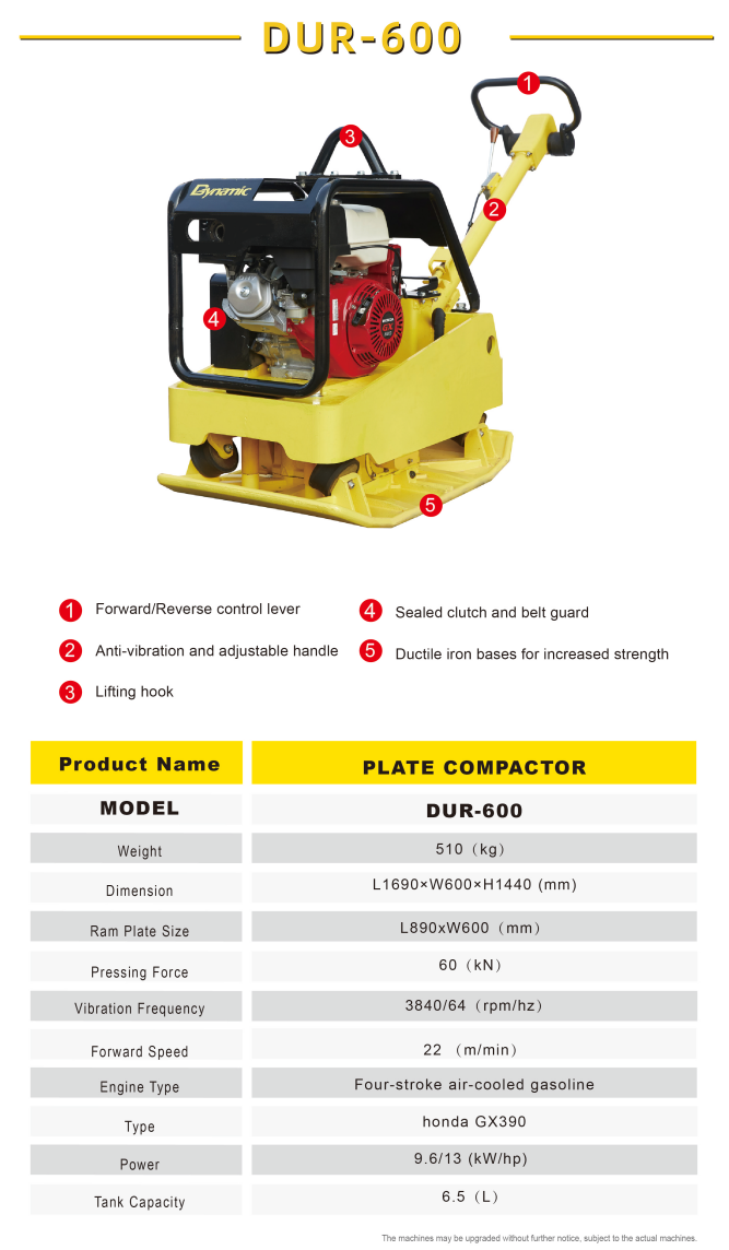 DUR-600 plate compactor, with a dead weight of 510 kg and a pressing capacity of 60 kN (about 6 tons), has excellent design and excellent manufacturing technology to ensure the perfect performance of the machine during operation. Honda GX-390 engine isequipped as standard, with a power of 13 horsepower, strong power and simple maintenance. It is easy and fast to start with one button electronic ignition. There are also high-quality diesel engines to choose from. In addition, engines meeting EPA certification can be selected